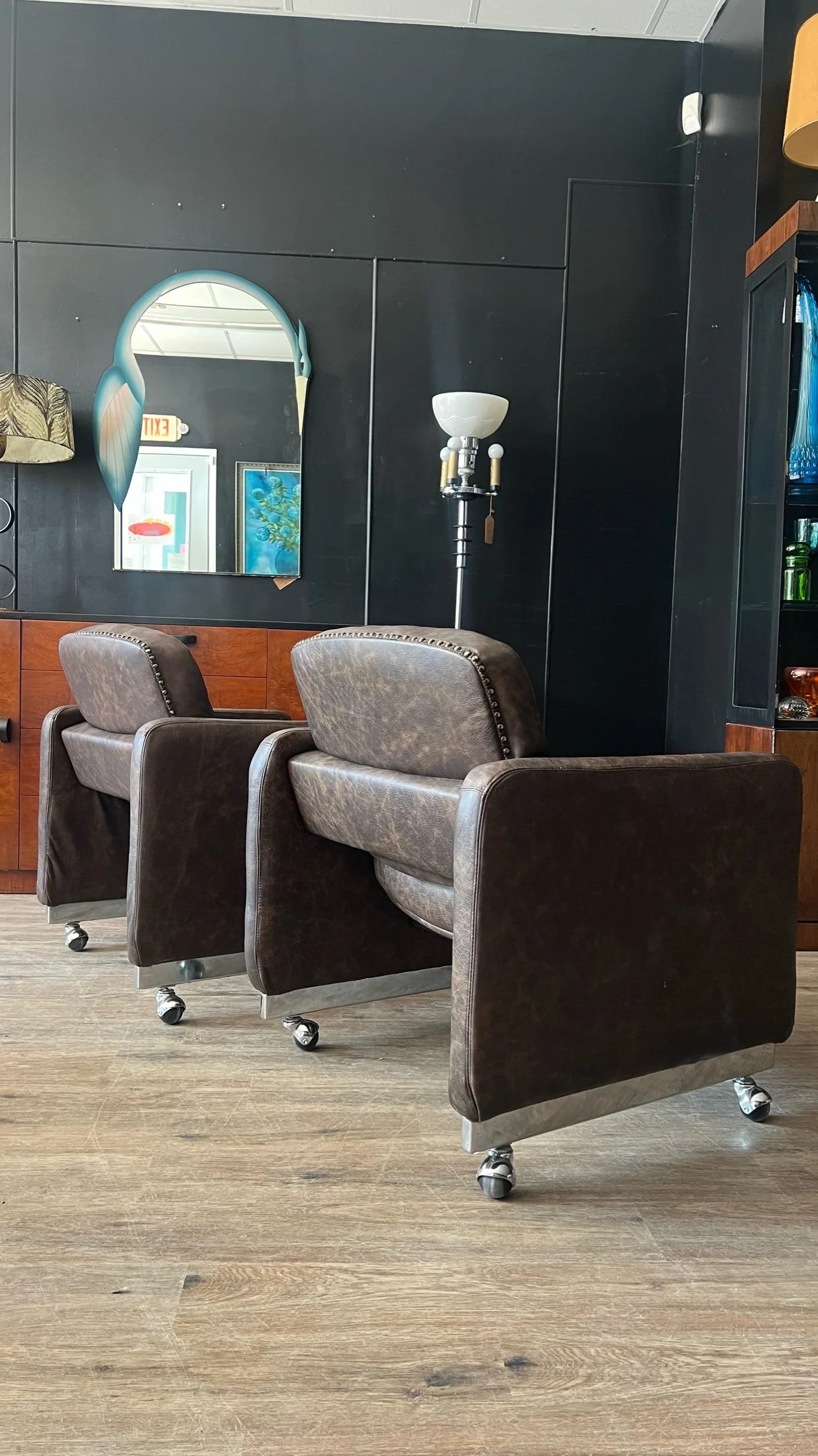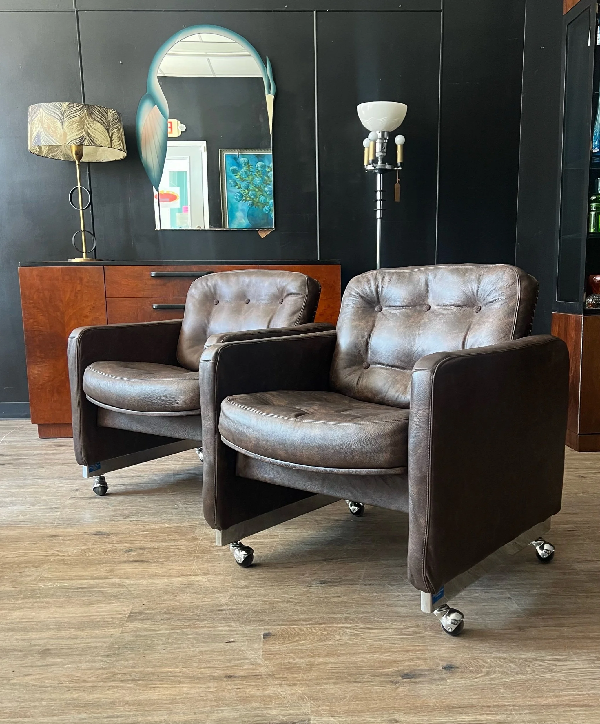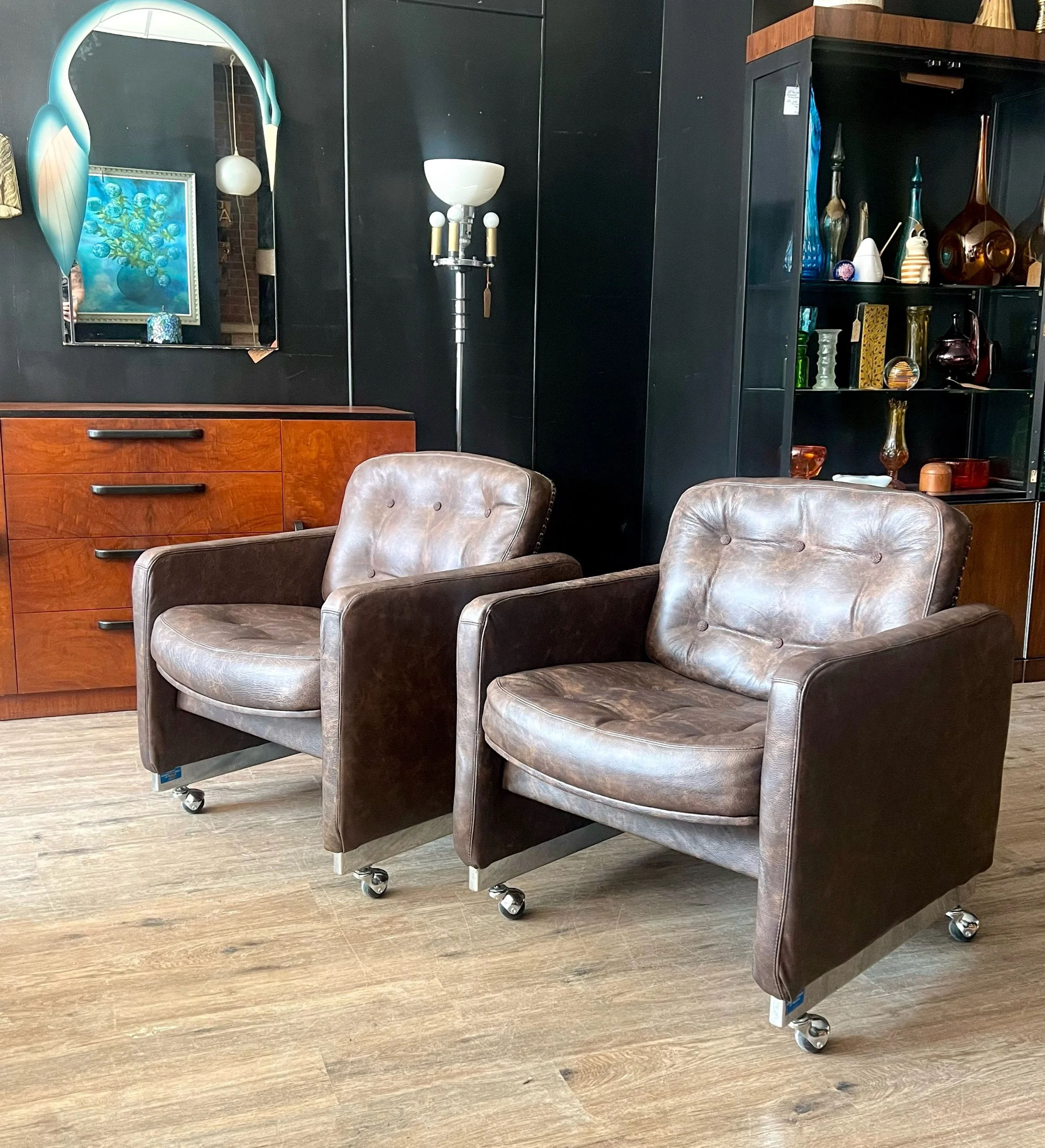 Fully restored by Janine’s Classic Furniture Upholstery. Full leather hide upholstery with chrome accents—three hides used across the pair. Extremely comfortable.