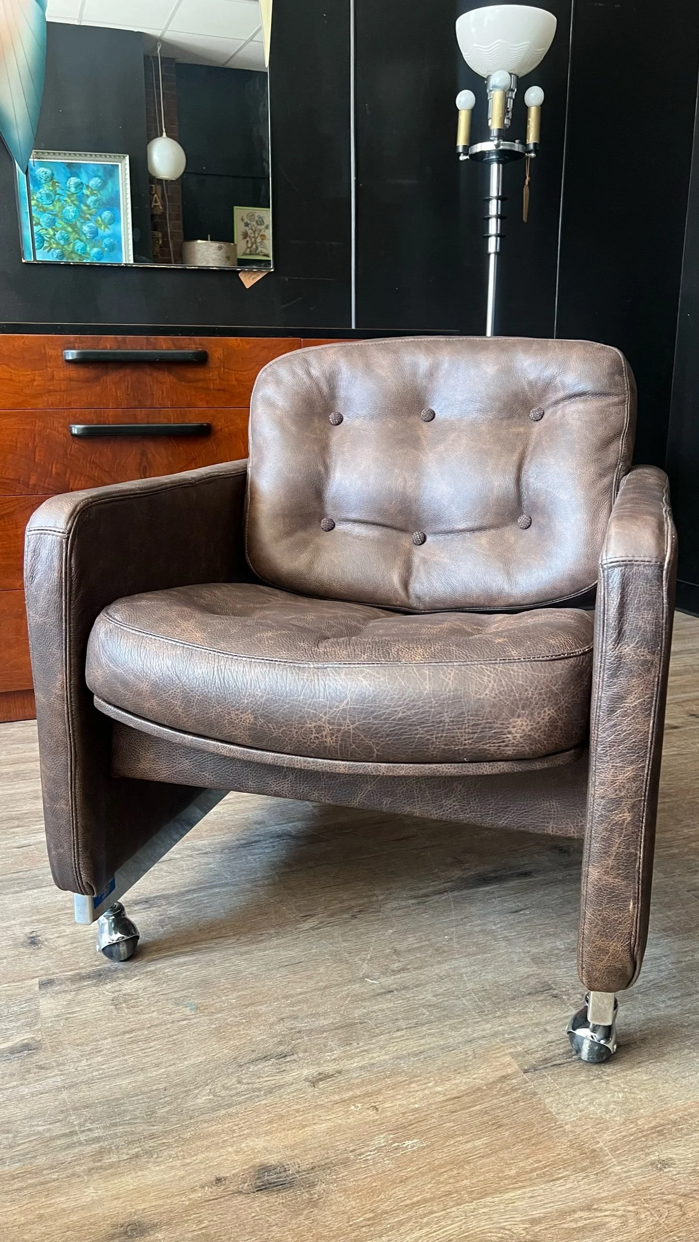 Substantial weight with casters for ease of movement. Leather will continue to wear in nicely over time. No major issues to note. Made in Canada