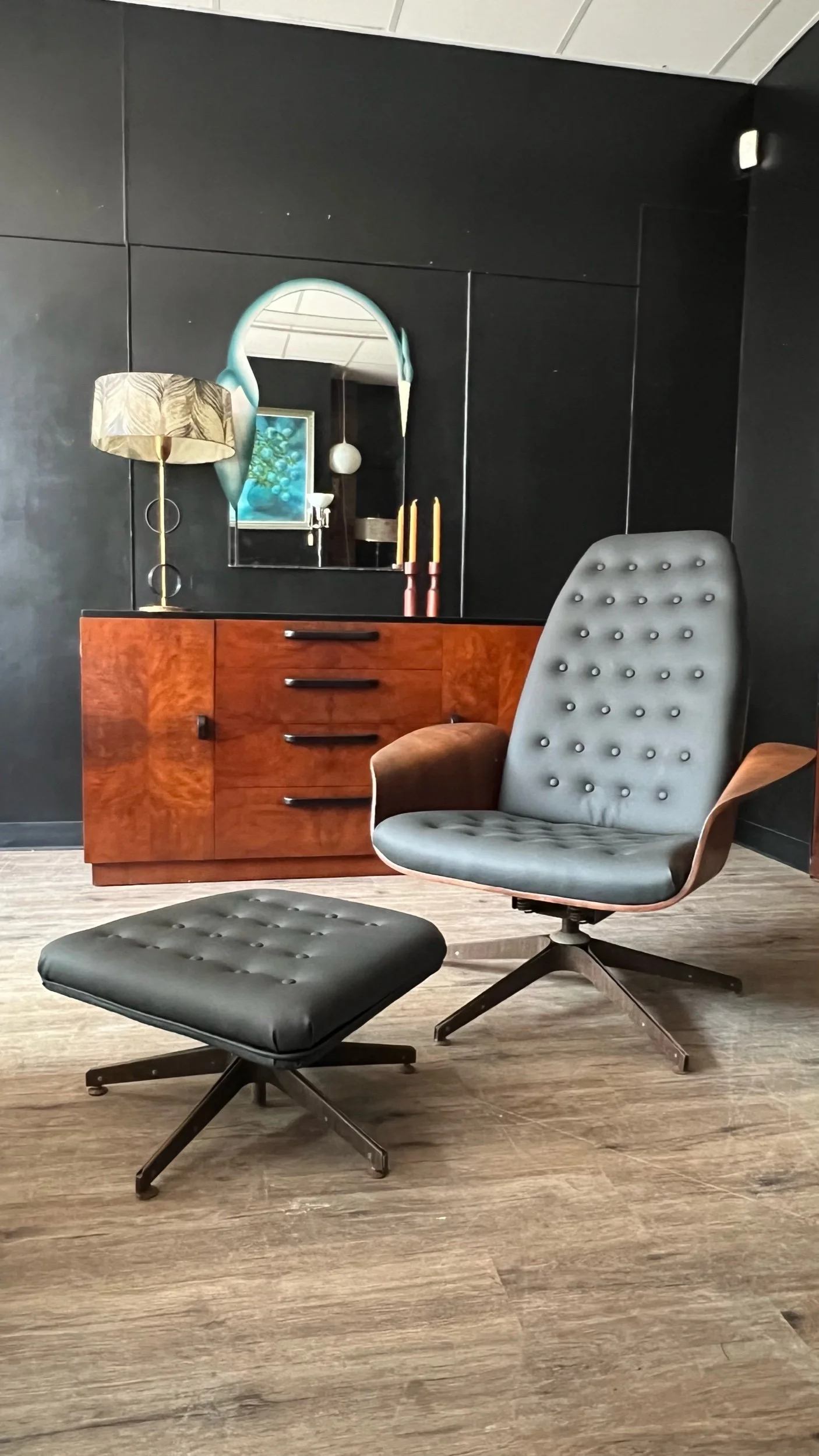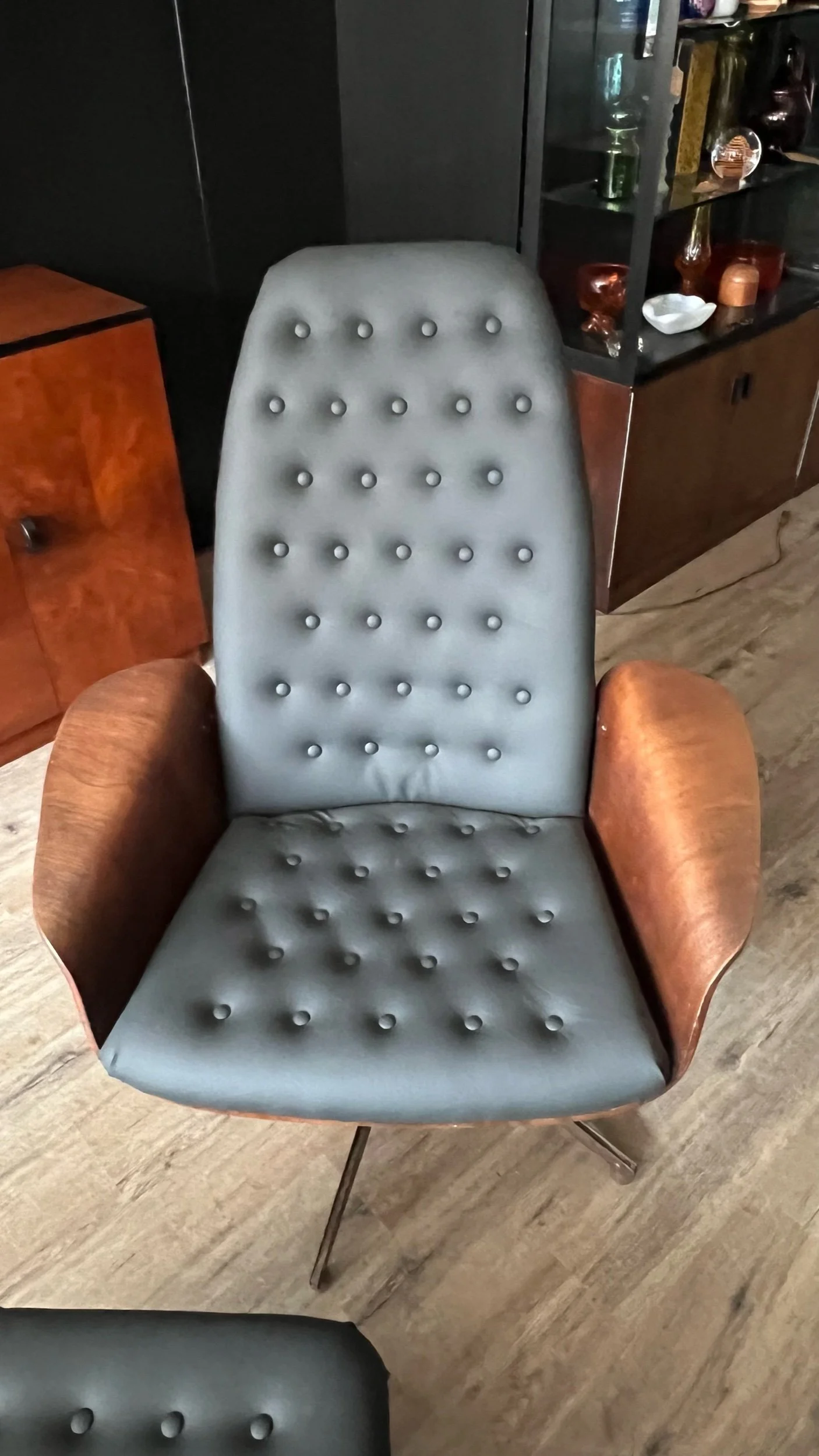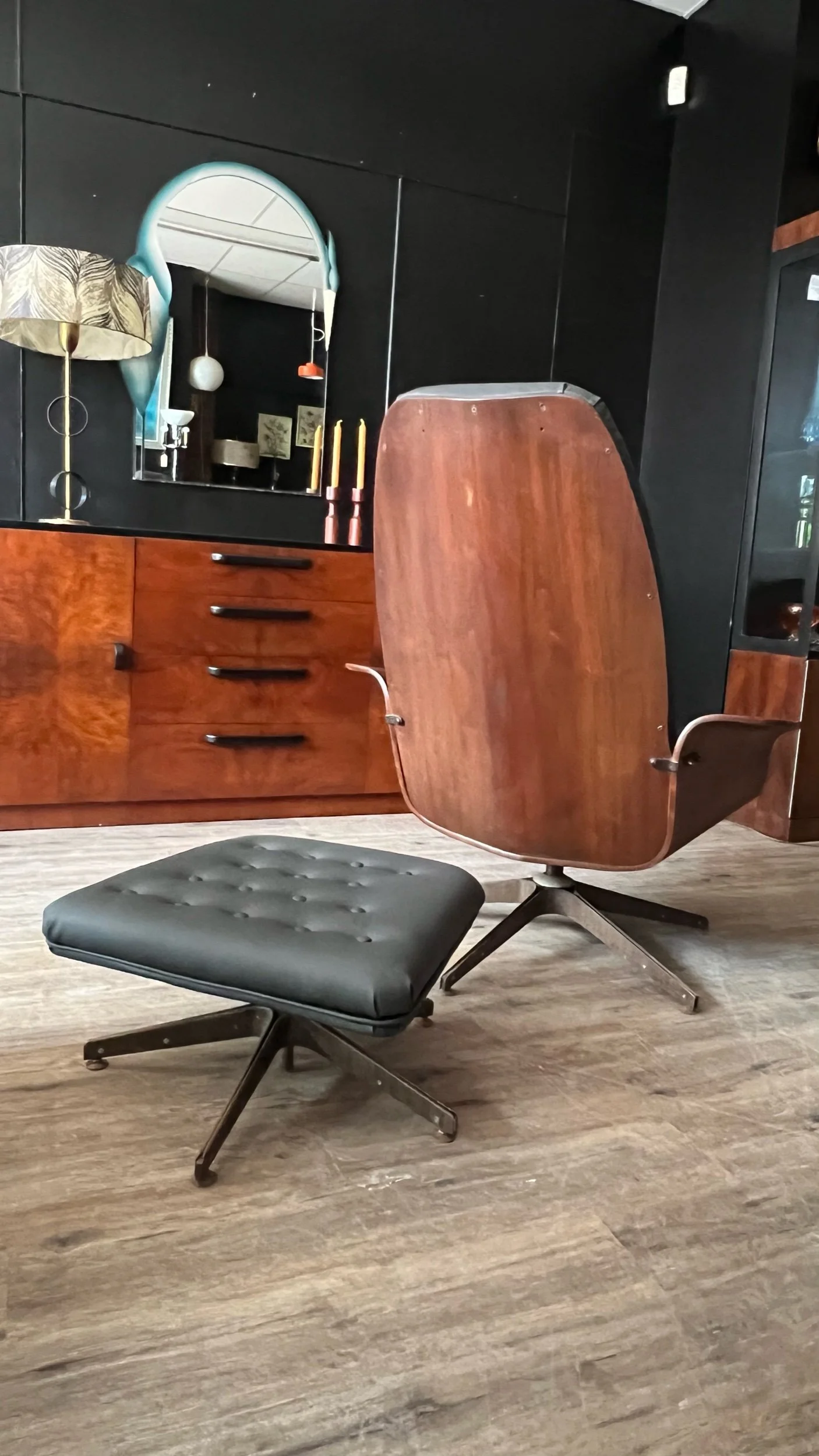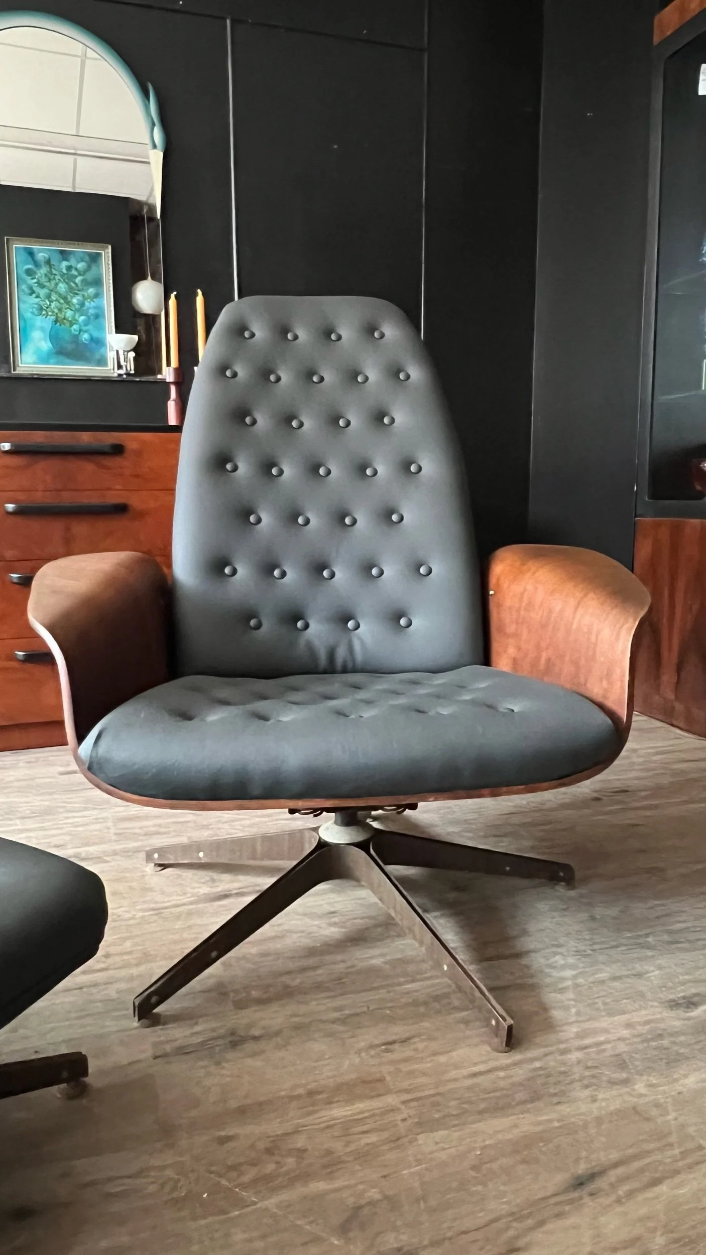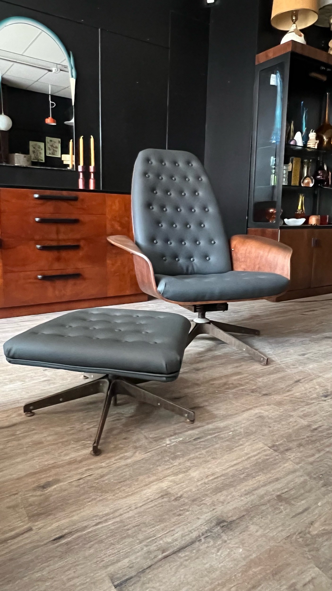 Offering this fully restored George Mulhauser for Plycraft “Mr. Chair.” The upholstery, done by Janine’s Classic Furniture Upholstery, pairs beautifully with the restored walnut molded plywood shell. Everything is in excellent condition.